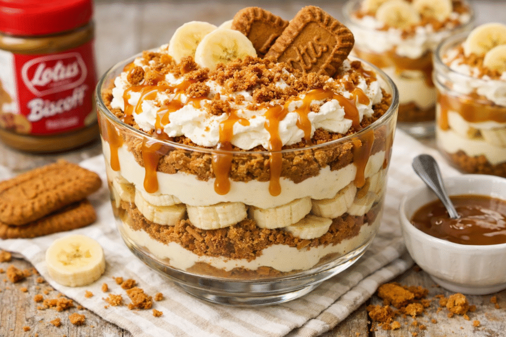 Banana pudding has long been a classic dessert loved across generations; however, this version takes it to a whole new level. By adding crushed Biscoff cookies and rich caramel sauce, the dessert gains depth, crunch, and visual appeal. Additionally, because this recipe is no-bake, it is perfect for both beginner cooks and experienced dessert lovers who want impressive results without turning on the oven.
