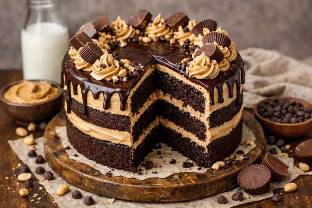 In conclusion, Chocolate Peanut Butter Cake is a dessert that delivers bold flavor, rich texture, and visual appeal all in one. From the moist chocolate layers to the creamy peanut butter frosting, every element works together to create a satisfying and memorable dessert. Moreover, its adaptability makes it suitable for many occasions, from casual gatherings to special celebrations.