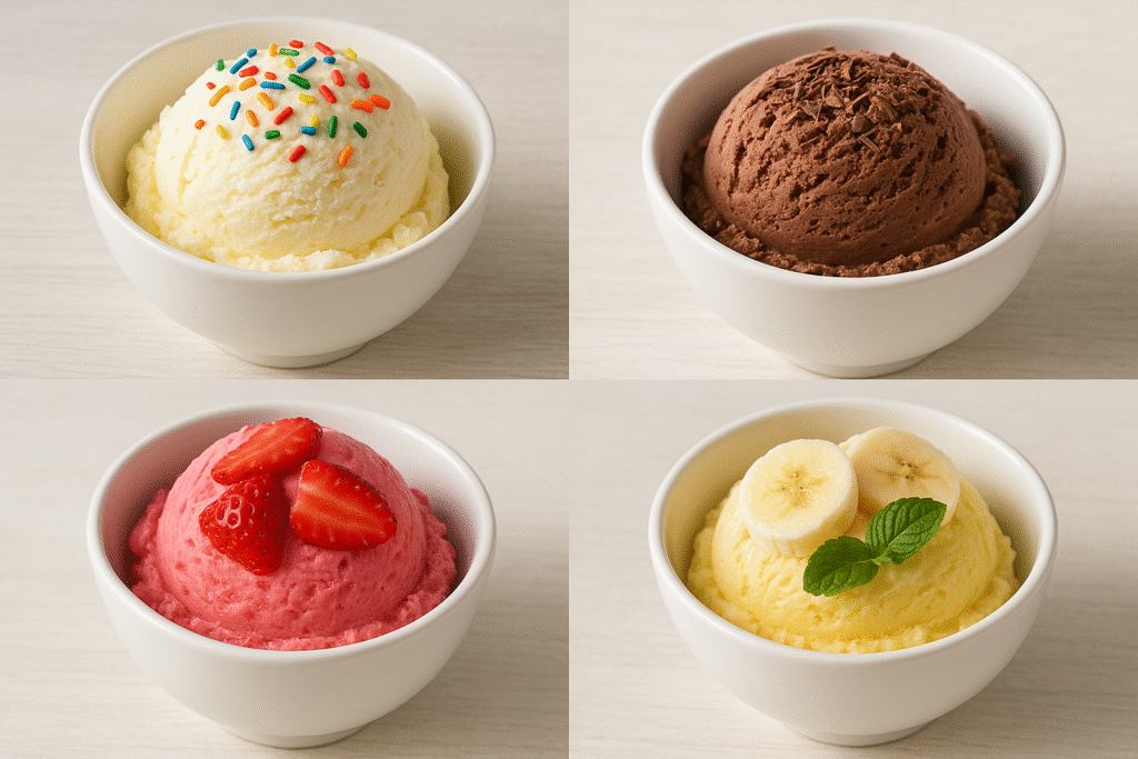 En este artículo descubrirás cuatro recetas irresistibles: helado de vainilla con granillos de colores, helado de chocolate con virutas, helado de fresa con trozos frescos y helado de plátano con hojas de menta. Cada una tiene un encanto especial, ya sea por la cremosidad, el sabor intenso o la frescura que transmiten.
