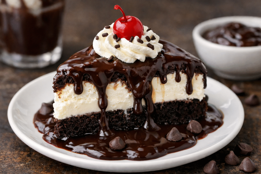 Few desserts manage to combine drama, indulgence, and pure joy quite like a Hot Fudge Ice Cream Cake Slice. From the very first look, this dessert promises contrast: cold, creamy ice cream paired with rich, glossy hot fudge, all layered with cake or crunchy elements that add structure and excitement. Because of this balance, every bite feels indulgent, comforting, and memorable at the same time.