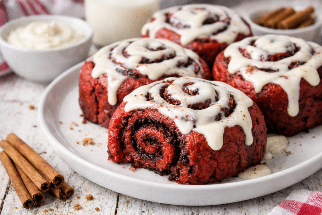 Presentation adds to the appeal of Red Velvet Cinnamon Rolls; therefore, thoughtful serving makes them even more inviting. Start by arranging the rolls tightly in a baking dish; meanwhile, allow frosting to cascade naturally over the sides. Then, add a light dusting of powdered sugar or decorative drizzle for visual impact.
